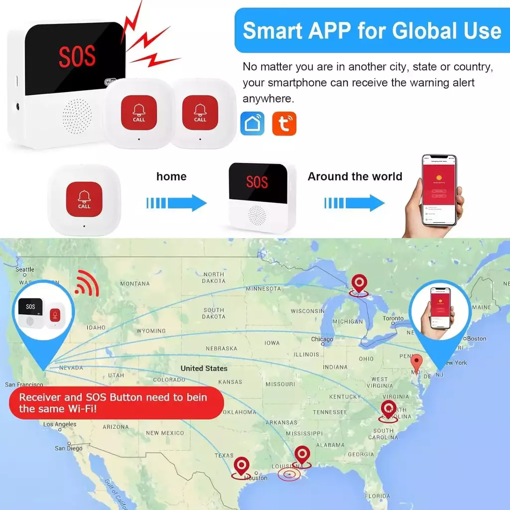 Compatível com os aplicativos Tuya/Smart Life, conecta-se ao celular via Wi-Fi 2,4 GHz (não suporta 5G). O cuidador recebe o alerta no app de qualquer lugar, garantindo monitoramento remoto confiável.